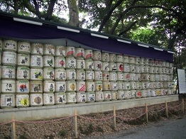 Ich kenne mich in Tokyo nicht aus, deshalb war es das erste Mal, dass ich Meiji-Schrein besucht habe. Auf dem Weg bis zum Schrein findet man mehrere Fässer von Wein und Sake. Sie waren leer, aber der Inhalt wird bei Festlichkeiten für Gäste angeboten. Vor dem Schrein habe ich einen Holztafel gekauft, auf dem wir unseren Namen und einen gemeinsamen Wunsch "Frieden für alle" geschrieben und an die Wand gehangen haben.(東京はあまり知らないので明治神宮も初めてでした。お宮に行く途中にワインやお酒のたるが飾ってありましたが中身は空っぽで、ワインとお酒は行事があるときに振舞われます。お宮では絵馬を買い、それぞれの名前と「みんなに幸福を」 と書いて奉納しました。)