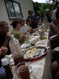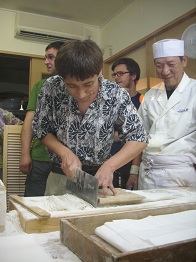 Diesen Abend haben wir mit Slow Food-Mitgliedern von Hadano und Tokyo verbracht. Wir haben bei dem Soba-Meister Herrn Ishii die Sobanudel-Herstellung lernen können, aber es war nicht ganz einfach, so dass wir beim Sobanudel-Essen von dem Unterschied zwischen dem Meister und Laien erfahren mussten. Nach der Sobanudel-Herstellung haben wir BBQ aus Meeresfrüchten, Fisch und frisches Gemüse gehabt. Sazae (eine Muschelart) war für meine deutsche Freunde zu exotisch, aber ansonsten hat alles gut geschmeckt. Während des Essens gab es reichliche Musik und Gesang. Es war ein Abend, den wir nie vergessen werden.(その夜はスローフード秦野と東京のメンバーと過ごしました。まず、石庄庵の石井さんが私たちにそば打ちを教えてくださいましたが、そんなに簡単に行くものでもなく、そばを食べるときに職人と素人の違いを思い知らされました。その後、海鮮バーベキューをしてくださり、サザエのつぼ焼きはドイツ人の友達には少しエキゾチックすぎたようですが他のものはとてもおいしくいただき、また、素敵な音楽と歌で盛り上がりました。)